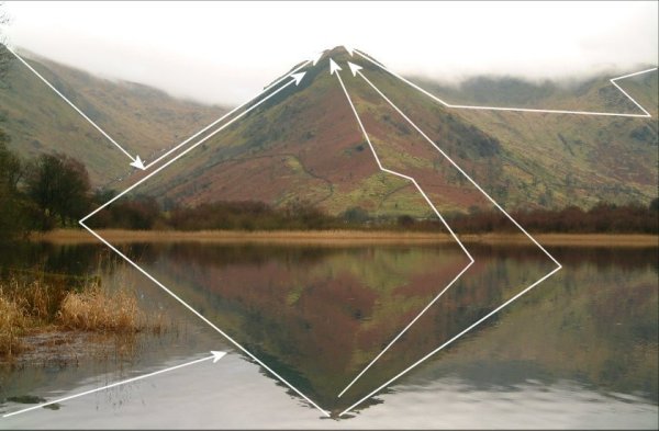 See how the lines run all over the place? But where do they all eventually lead our eyes? You can draw quite a few more, if you like, but they will all eventually take your eyes to the summit of the hill. My feeling is that this image works because of the colours used, the use of the reflection as an compositional element, and it is striking for the very reason that it breaks the rules!