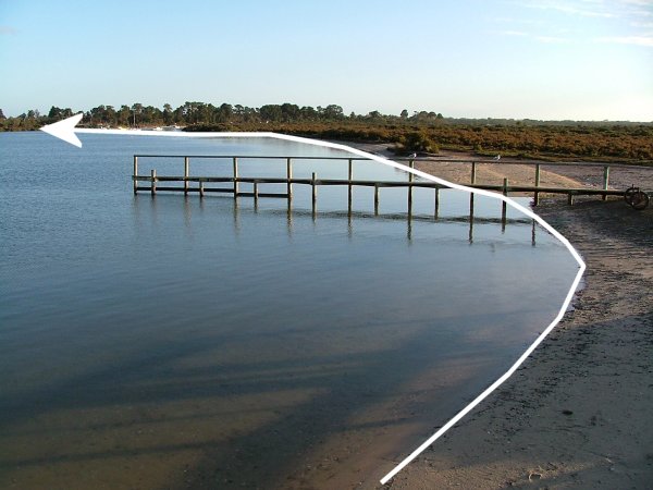 The arrowed line shows the "route" our eyes take across the image. It is a gentle curve (well, marred only by my inability to make it smoother!) with no deviations. The shoreline leads the eye across the whole of the scene, and as the eye travels along this curve, we pick up the other essential details.